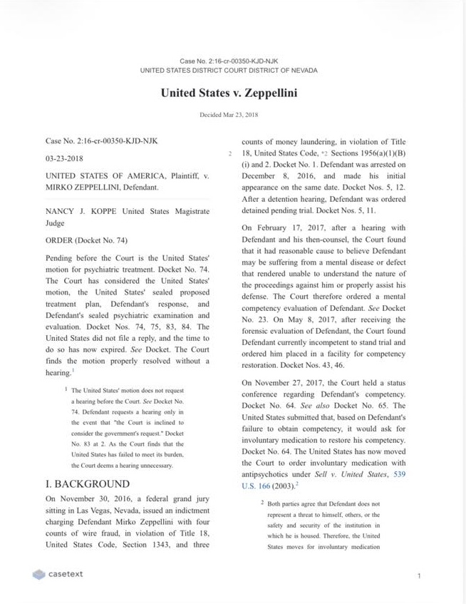 Il processo federale United States v. Zeppellini (2:16-cr-00350) fu aperto in Nevada il 30 novembre 2016 a seguito di un’incriminazione (indictment) per reati che rientrano nella giurisdizione federale degli Stati Uniti per truffe plurime e riciclaggio di denaro.