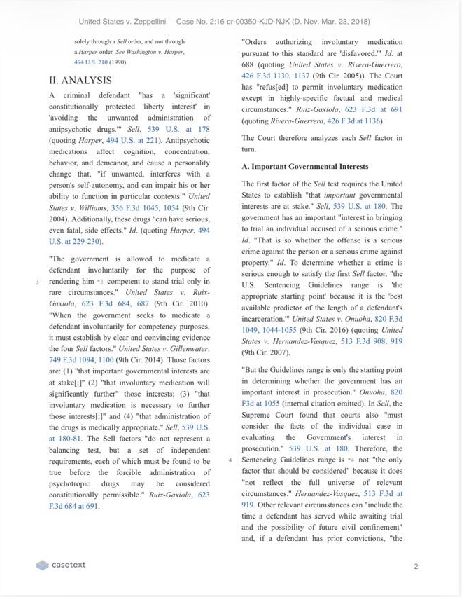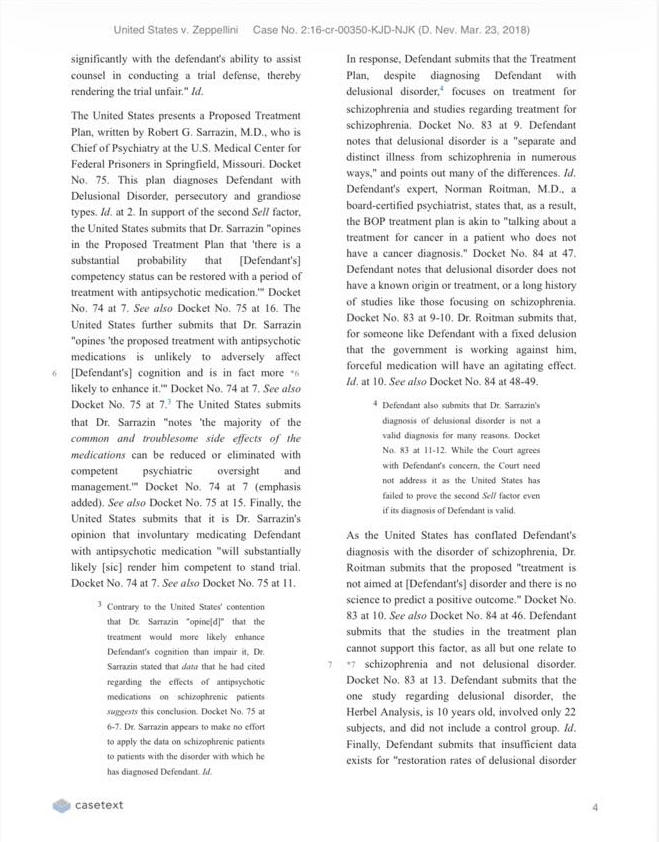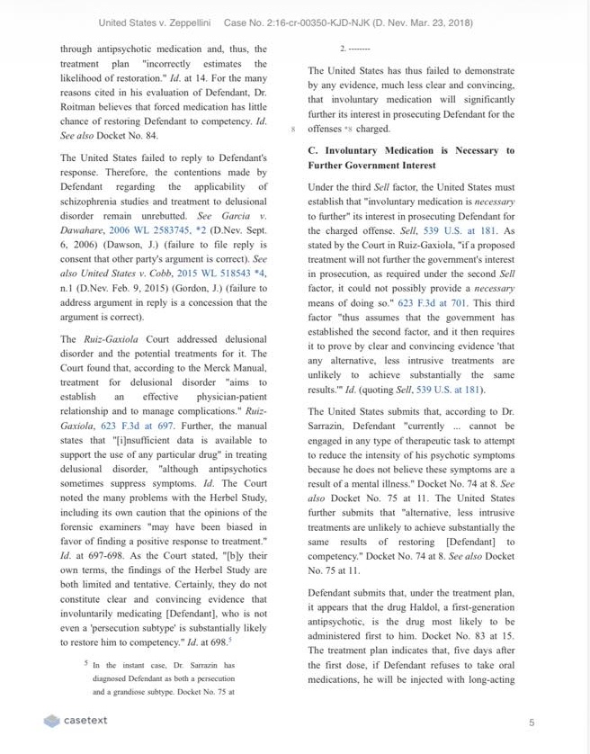 Il tribunale ha autorizzato Roitman a valutare Zeppellini in merito ai cosiddetti “Sell factors”. Si tratta di criteri legali utilizzati negli Stati Uniti per determinare se il governo possa somministrare forzatamente farmaci antipsicotici a un imputato al fine di renderlo mentalmente idoneo (competent) a sostenere un processo.